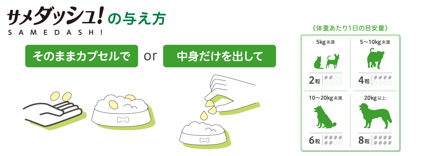 ※そのまま与えるのが難しい場合は、水やぬるま湯でカプセルに浸し、柔らかくしてから与えてください。また、針やハサミなどでカプセルを切って、中身をフードやおやつに混ぜて与えていただいても問題ありません。
