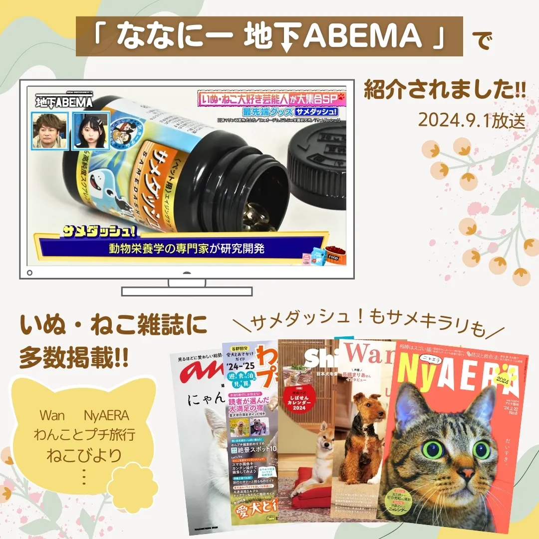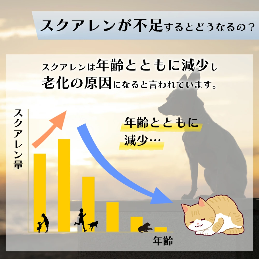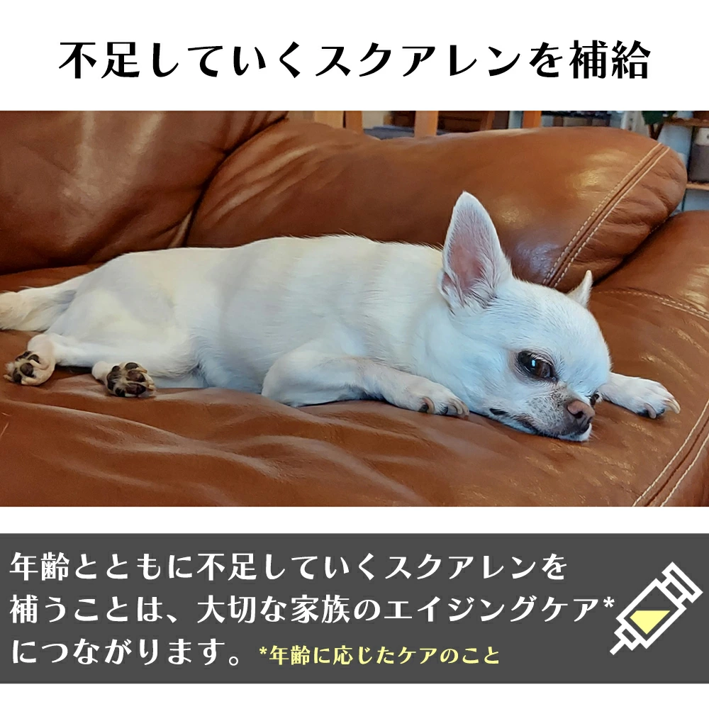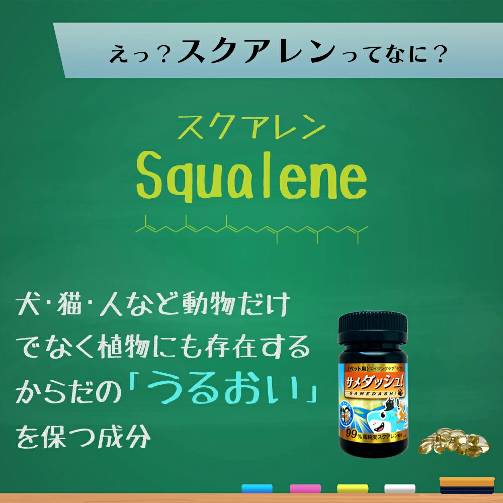 動物栄養学の専門家たちが研究開発した、小さな家族のためのエイジングケア*サプリメント。サメダッシュ!に配合されているスクアレンは、体のうるおい成分。年齢とともに減少するスクアレンを補給することで、愛する小さな家族の健康をサポートします!